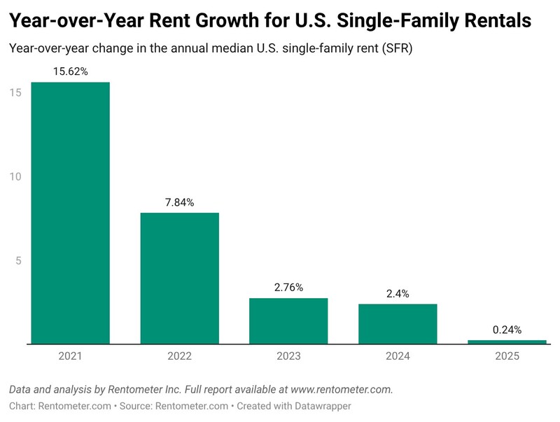 The single-family rental market, home to more than 40 million Americans, has shifted dramatically over the past three to four years. After posting strong year-over-year rent growth of 7.8% in 2022 and nearly 3% in 2023, gains cooled to 2.4% in 2024 and slowed further in 2025, with annual growth falling to just under 0.25%.