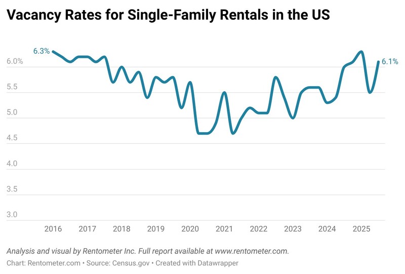 The current stagnation is driven by a "perfect storm" of supply and economic factors. Single-family vacancy rates reached 6.3% in early 2025, the highest level in nearly a decade. Although vacancies stabilized later in the year (6.1% in Q3 2025), they remain elevated relative to recent history.