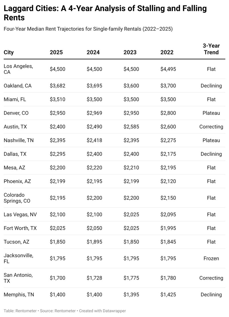City-level results show that the slowdown is not only a 2025 phenomenon. For several high-profile cities, the "rental boom" effectively ended in 2022 with little to no meaningful rent growth over the past three to four years, and in some cases, rents have moved lower since the 2022–2023 period. In other words, these laggard cities reflect a broader phase of stabilization (or correction) rather than a temporary year-over-year dip.