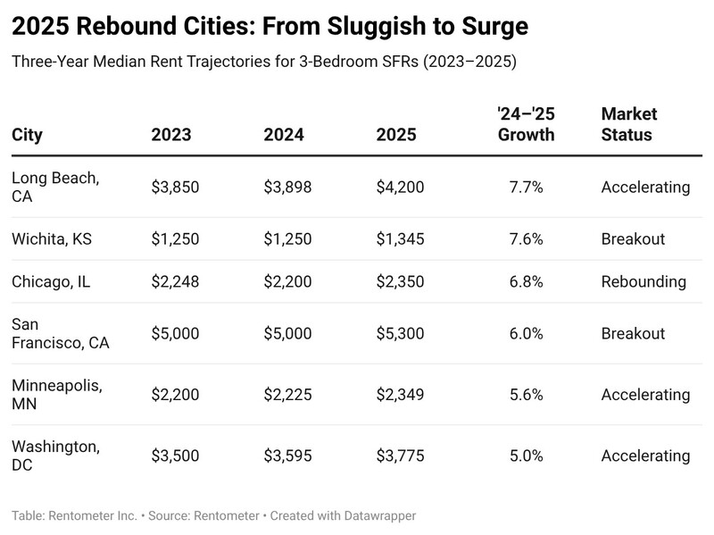 What stands out in 2025 is the divergent behavior among these premium hubs. While Los Angeles ($4,500) and Boston ($4,000) have hit a hard pricing ceiling with 0.0% year-over-year growth, others are seeing a renewed surge. Long Beach (7.7%) and San Francisco (6.0%) recorded significant gains, and after years of stagnation, high-income renters are once again competing for limited single-family inventory in core coastal markets.