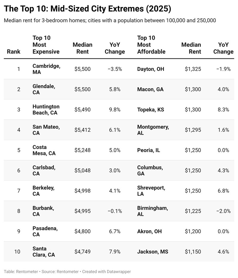 On the high end, the mid-sized leaderboard is dominated yet again by California coastal and near-coastal cities, alongside Greater Boston. Cambridge, MA ($5,500) and Glendale, CA ($5,500) top the list, with several other California markets close behind, including Huntington Beach ($5,490; +9.8%), San Mateo ($5,412; +6.1%), and Costa Mesa ($5,248; +5.0%). Notably, these mid-sized markets sit above the most expensive large-city market in the dataset (San Francisco at $5,300), underscoring how high-income, supply-limited submarkets can command premium rents even without major city population scale. Growth in this segment was also stronger than in many large-city markets, led by Huntington Beach (+9.8%), Santa Clara (+7.9%), and Pasadena (+6.7%), suggesting that pricing power remains intact in select high-demand pockets.