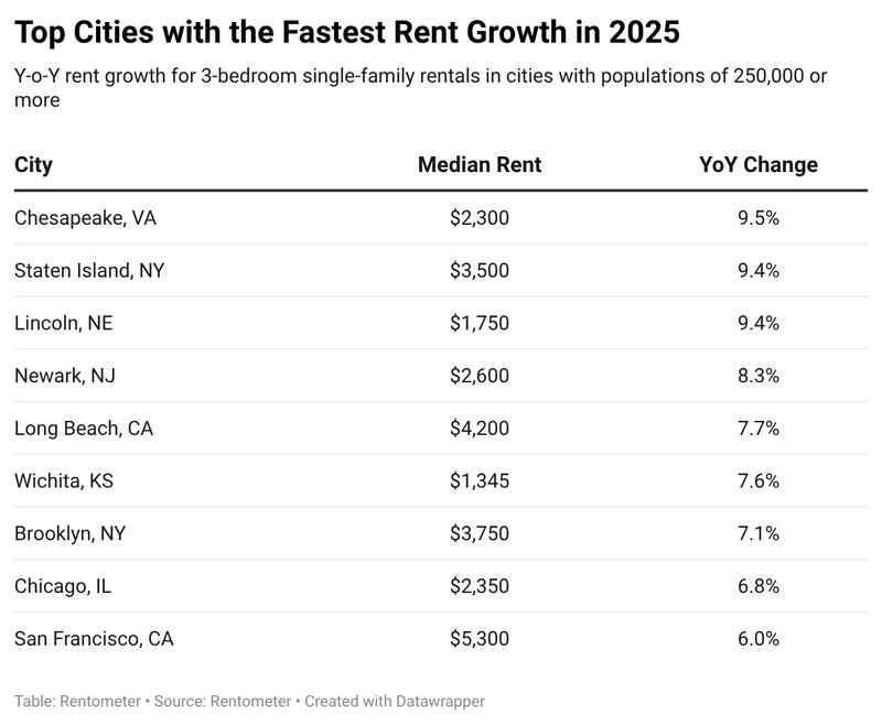 Even in a year of near-flat national growth, a small group of cities posted outsized rent increases. Chesapeake, VA (+9.5% to $2,300) led the nation, followed closely by Staten Island, NY (+9.4% to $3,500) and Lincoln, NE (+9.4% to $1,750). Several other markets also saw strong gains, including Newark, NJ (+8.3% to $2,600), Long Beach, CA (+7.7% to $4,200), and Wichita, KS (+7.6% to $1,345). Large coastal and gateway cities returned to growth as well, with Brooklyn, NY (+7.1% to $3,750), Chicago, IL (+6.8% to $2,350), and San Francisco, CA (+6.0% to $5,300) all posting notable increases.