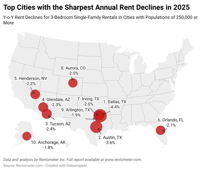 On the downside, the sharpest pullbacks were concentrated in the Sunbelt, especially Texas and Arizona. Dallas, TX (-4.4% to $2,295) and Austin, TX (-3.6% to $2,400) recorded the largest declines, followed by Tucson, AZ (-2.4% to $1,850) and Glendale, AZ (-2.3% to $2,100). Other notable declines included Henderson, NV (-2.2%), Orlando, FL (-2.1%), and several additional Texas markets—Irving (-2.0%) and Arlington (-1.9%)—reinforcing the pattern of cooling across previously high-growth Sunbelt locations.