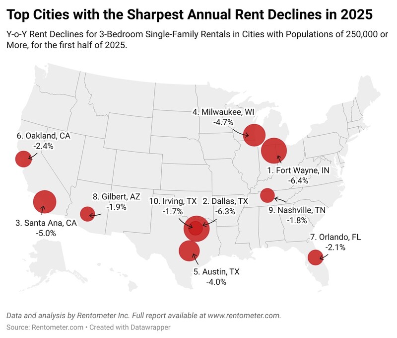 Florida stands out as an outlier within the region. After experiencing one of the strongest post-pandemic housing booms in the country, the state is now seeing signs of softening in both its rental and for-sale markets. Among the 119 Florida cities tracked by Rentometer, only 39% posted rent increases in the first half of 2025, while 13% were flat and 48% experienced price declines.