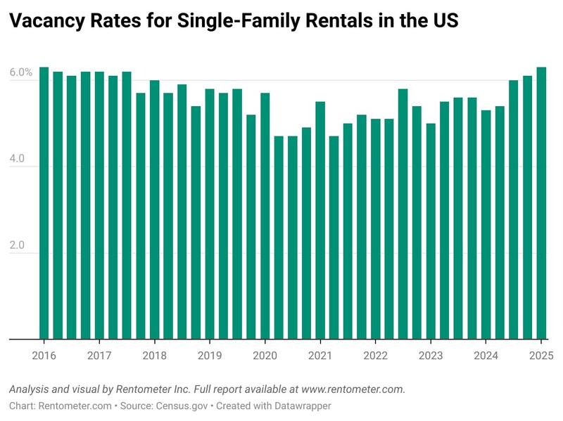 While median rents have slowly picked up again in 2025, they remain below historical growth levels. At the same time, vacancy rates for single-family rentals rose to 6.3% in Q1 2025 according to the latest Census report, up one percentage point from the same period in 2024—marking the highest level since the first quarter of 2016.