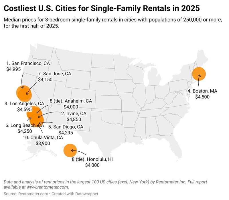 Cambridge, MA tops the list with a median asking rent of $6,000 for a 3-bedroom single-family home in the first half of 2025, up 7.1% year-over-year. In California, multiple cities exceed the $5,000 threshold, including Glendale, CA at $5,650 (up 10.2%), San Mateo, Costa Mesa, and Huntington Beach—all tied at $5,500 but with varying annual growth rates ranging from 7.8% to 10.0%.