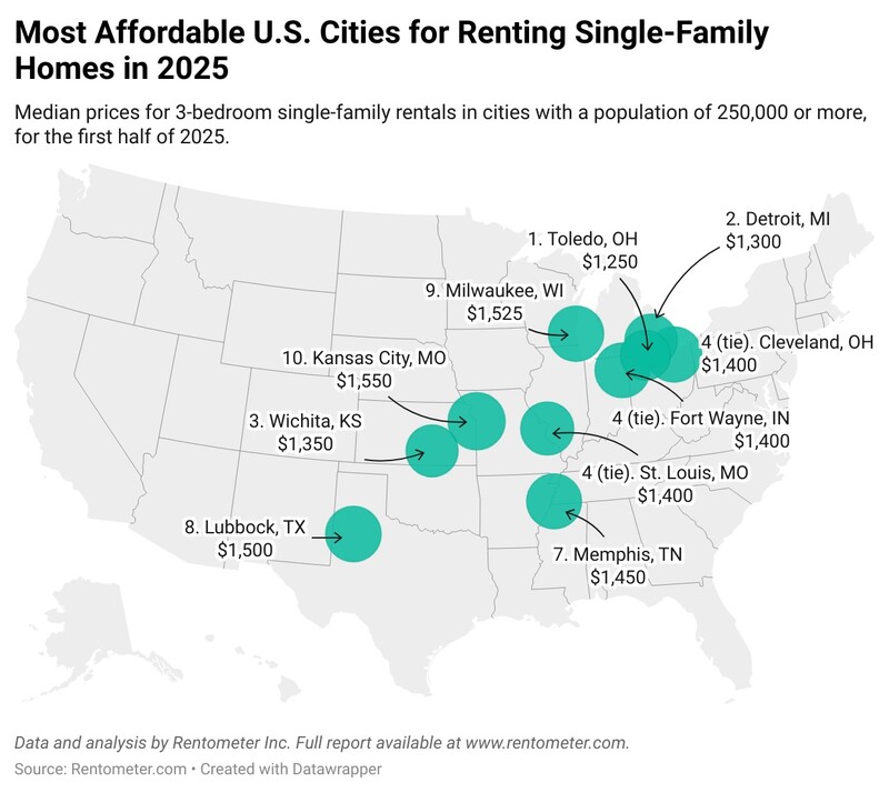 Renters looking for value will find it most often in the Midwest. Toledo is the most affordable large city in the U.S. to rent a single-family home, with median asking rents for 3-bedroom homes at $1,250. To comfortably afford that rent—using the recommended 30% of gross income rule—a household would need to earn about $50,000 per year, which is just above Toledo’s median household income of $49,700 (official 2023 figure, adjusted to May 2025 dollars).