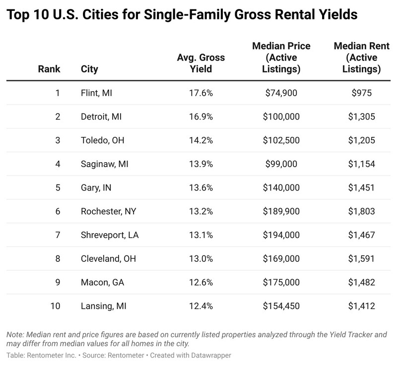 Rentometer’s highest-yield markets—led by Flint, Detroit, Toledo, Saginaw, Gary, and Rochester—are overwhelmingly located in the Great Lakes region and smaller Midwestern or Southern metros. These cities deliver gross yields of 11–17%, driven by low home prices and steady rental demand.