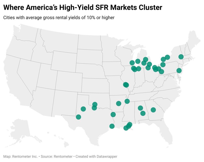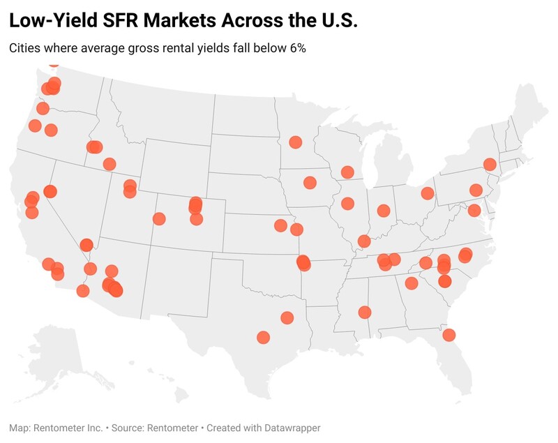 Low-yield conditions are also visible in parts of the Carolinas and Tennessee, including Charlotte, Raleigh, Murfreesboro, and Mount Juliet, where strong job markets and in-migration have driven up home prices faster than rents.